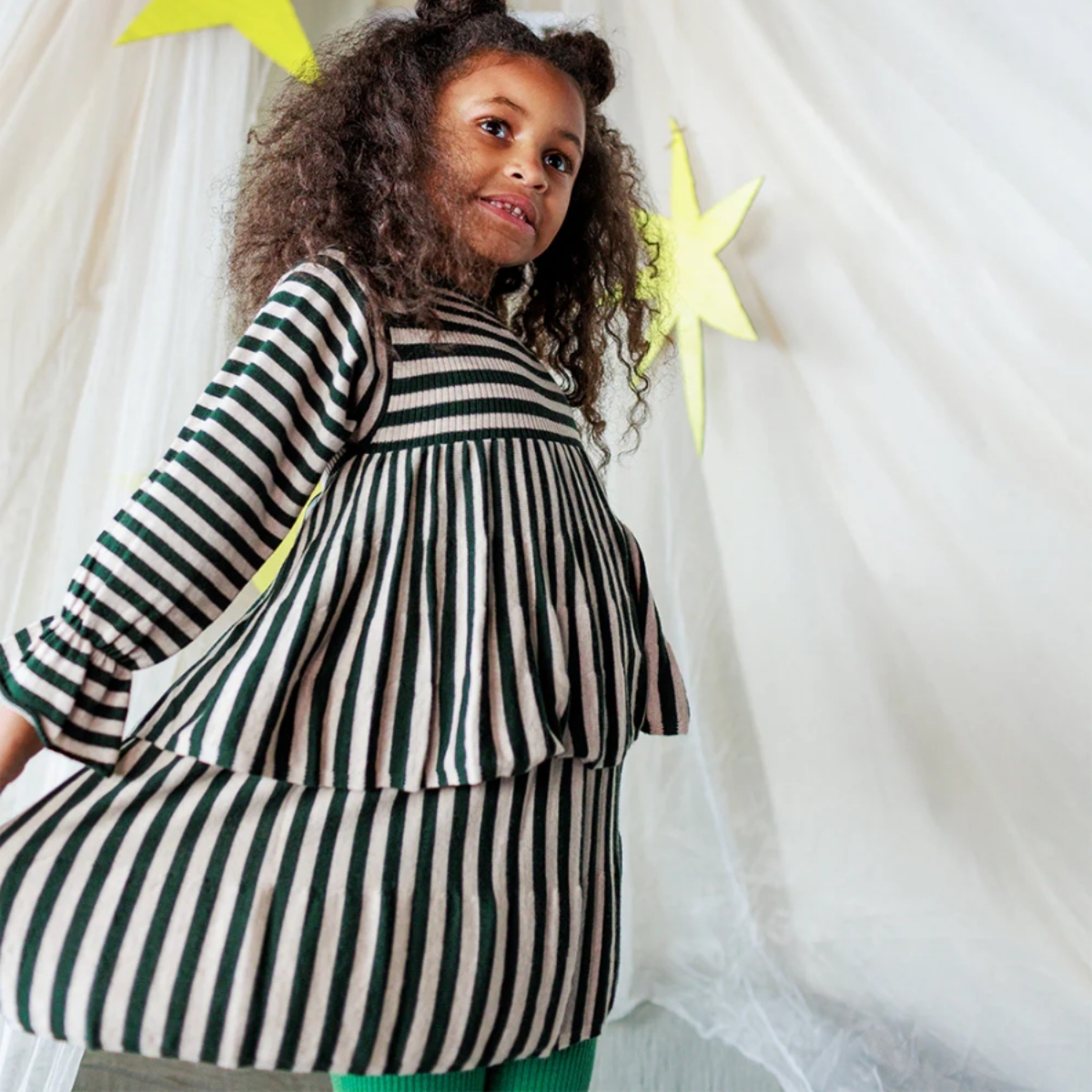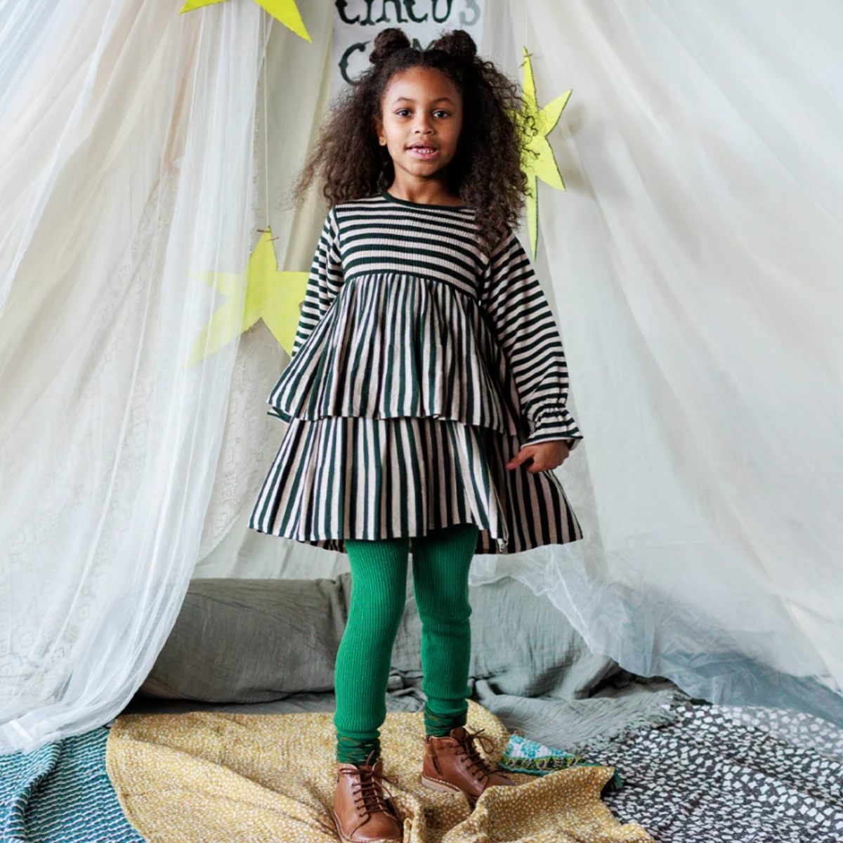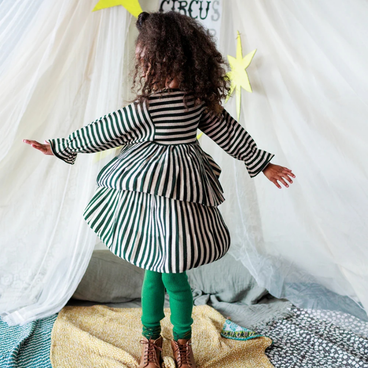 A cosy and comfortable dress with a voluminous A-line shape, with gently elasticated frill cuffs and two twirly circle skirt layers.