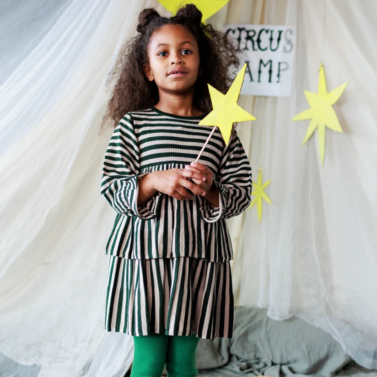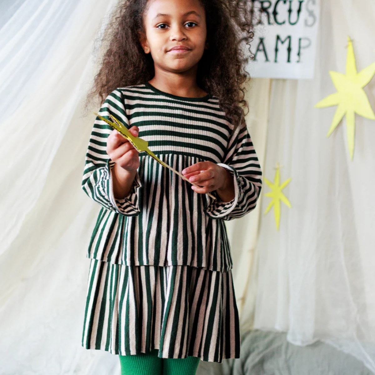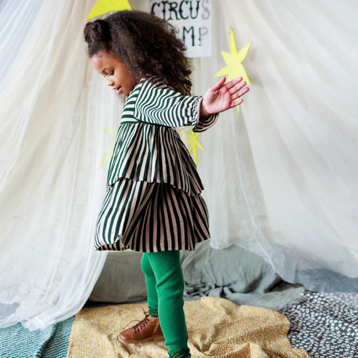 A cosy and comfortable dress with a voluminous A-line shape, with gently elasticated frill cuffs and two twirly circle skirt layers.